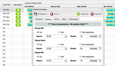 Le module permet de mieux gérer les particularités CCQ liées aux pauses (AM, dîner, PM) en automatisant les ajustements au temps payé selon que la pause a été prise ou non, tout en respectant les configurations établies pour chaque profile .