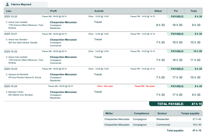 Vous avez également une option pour afficher un résumé de temps par métier, ce qui facilite le travail des personnes responsables de la paie.