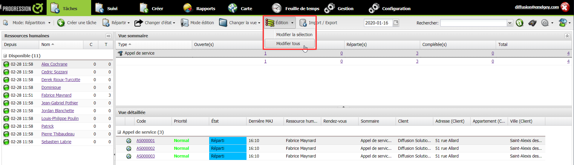 Il est désormais possible de modifier une sélection ou toutes les tâches en lot dans le mode Répartition. Ceci vous permettra de sauver du temps et d’éviter d’ouvrir chaque tâche pour appliquer une modification générale. Ainsi, seules les tâches présentent dans la vue détaillée seront modifiées.