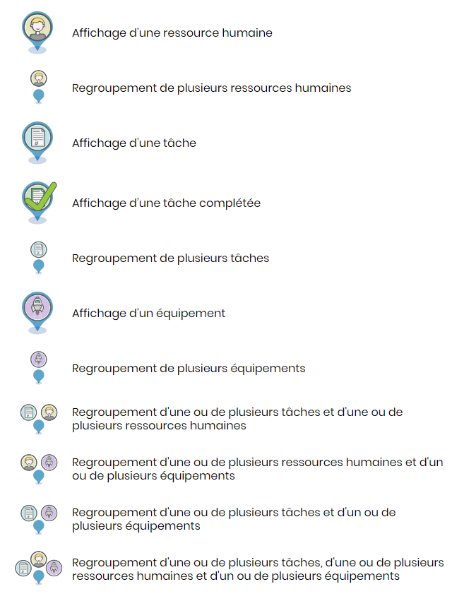 Modification des icônes des ressources humaines, tâches et équipements dans le module Carte